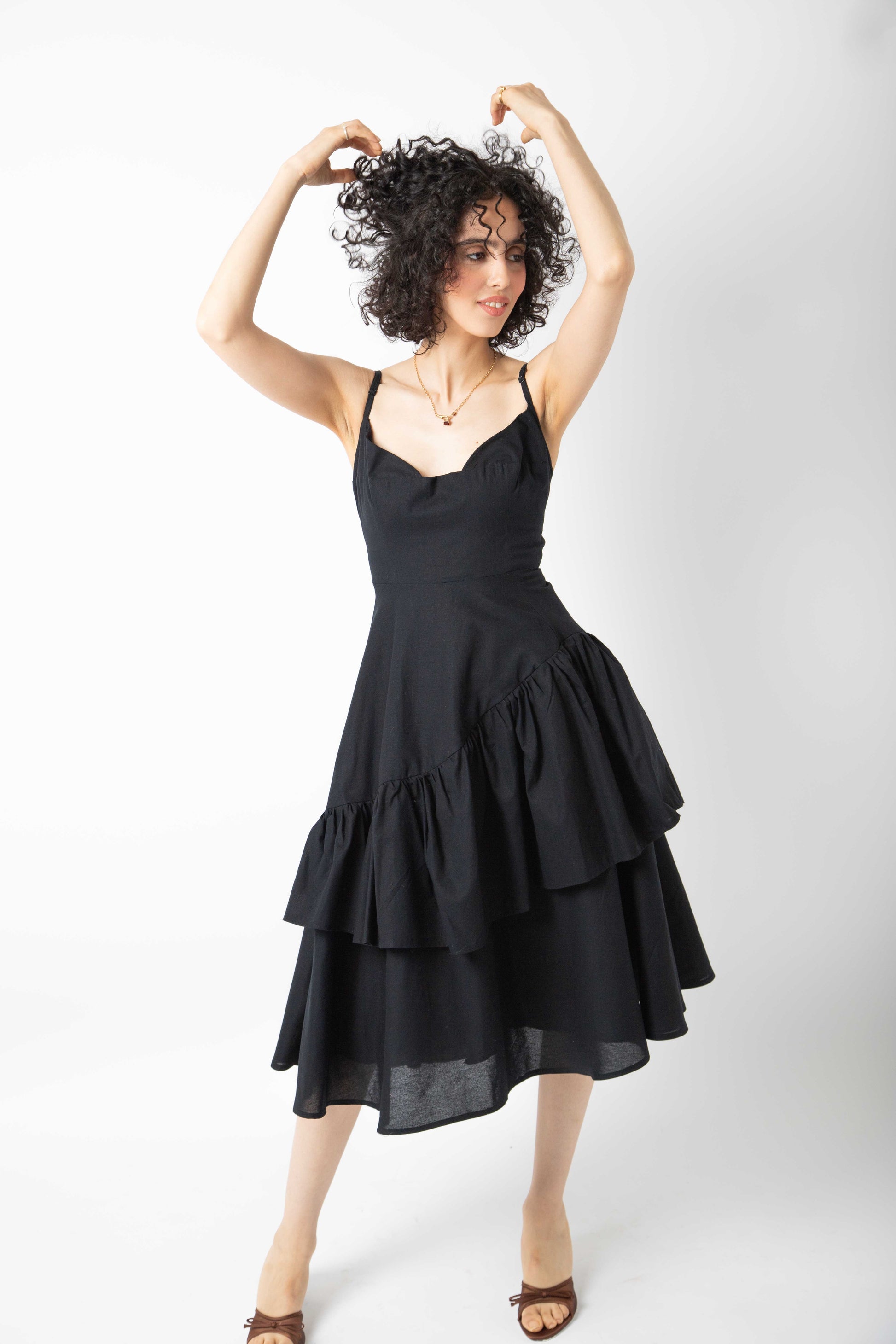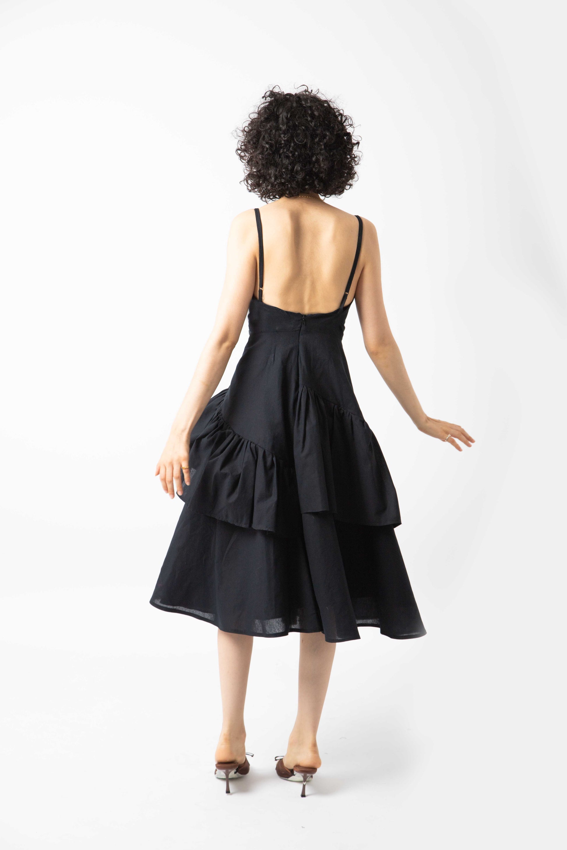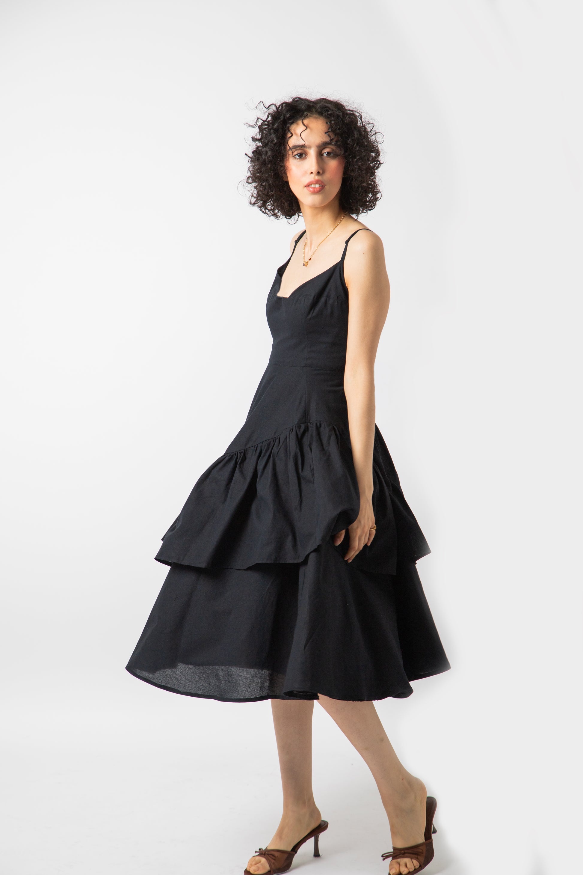 Effortlessly romantic, this handmade black cotton dress is crafted from a soft, airy weave that drapes like a dream. Designed with a fitted bodice, delicate straps, and a tiered midi-length skirt, it moves beautifully with every step.