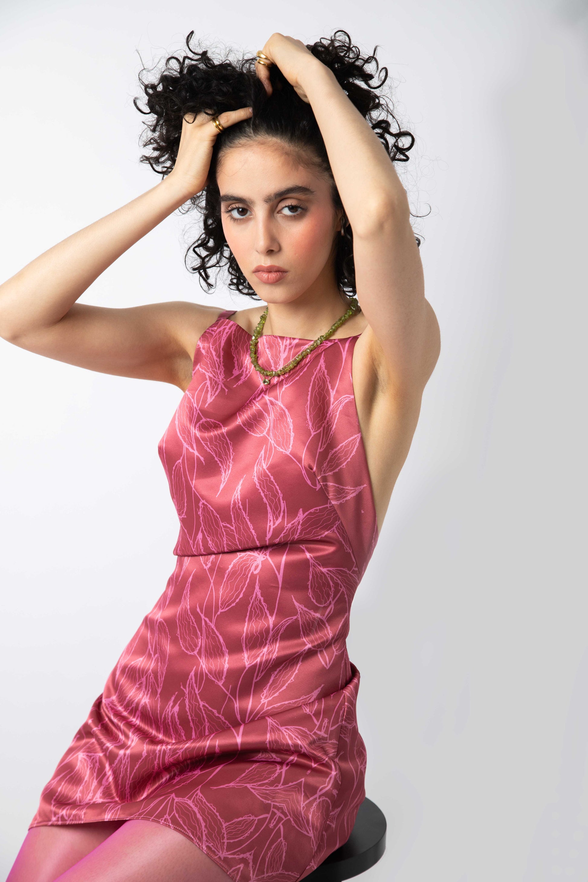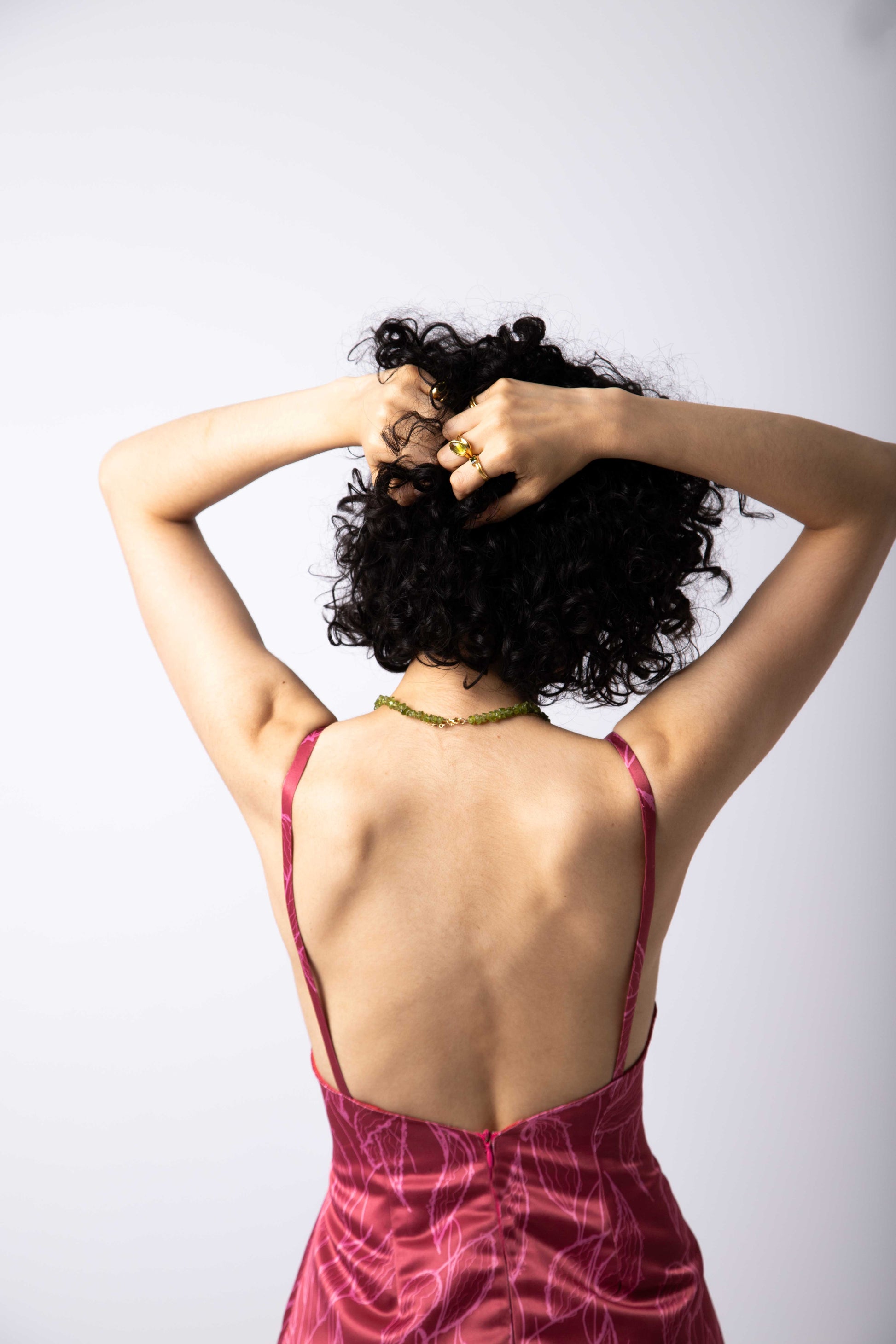 A wearable piece of art. This handmade mini dress is crafted from rich duchess satin and features an original hand-drawn print — sketched and designed by Des. With its sleek silhouette and soft sheen, it’s made to turn heads.